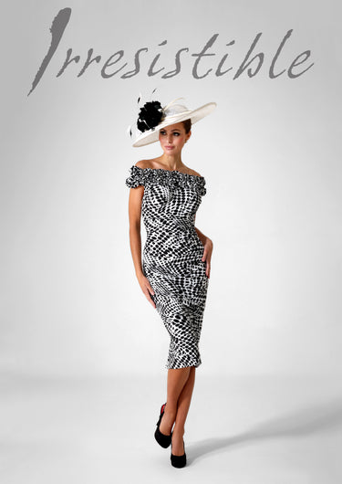 This elegant Irresistible IR7634K Black Spot dress features a knee-length, fitted silhouette with an off-shoulder design, making it an ideal choice for mothers of the bride or groom. Its classic black spot pattern adds a timeless touch, while the tailored fit enhances sophistication and grace for any formal occasion.