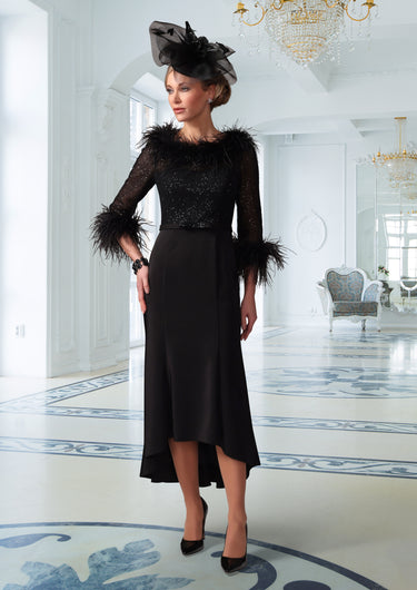 The Irresistible IR7726TJ Black midi dress exudes elegance with its dipped hem and feather detail. Perfect for black tie events or as a sophisticated mother of the bride or groom outfit. Elevate your style with this timeless and stunning dress.