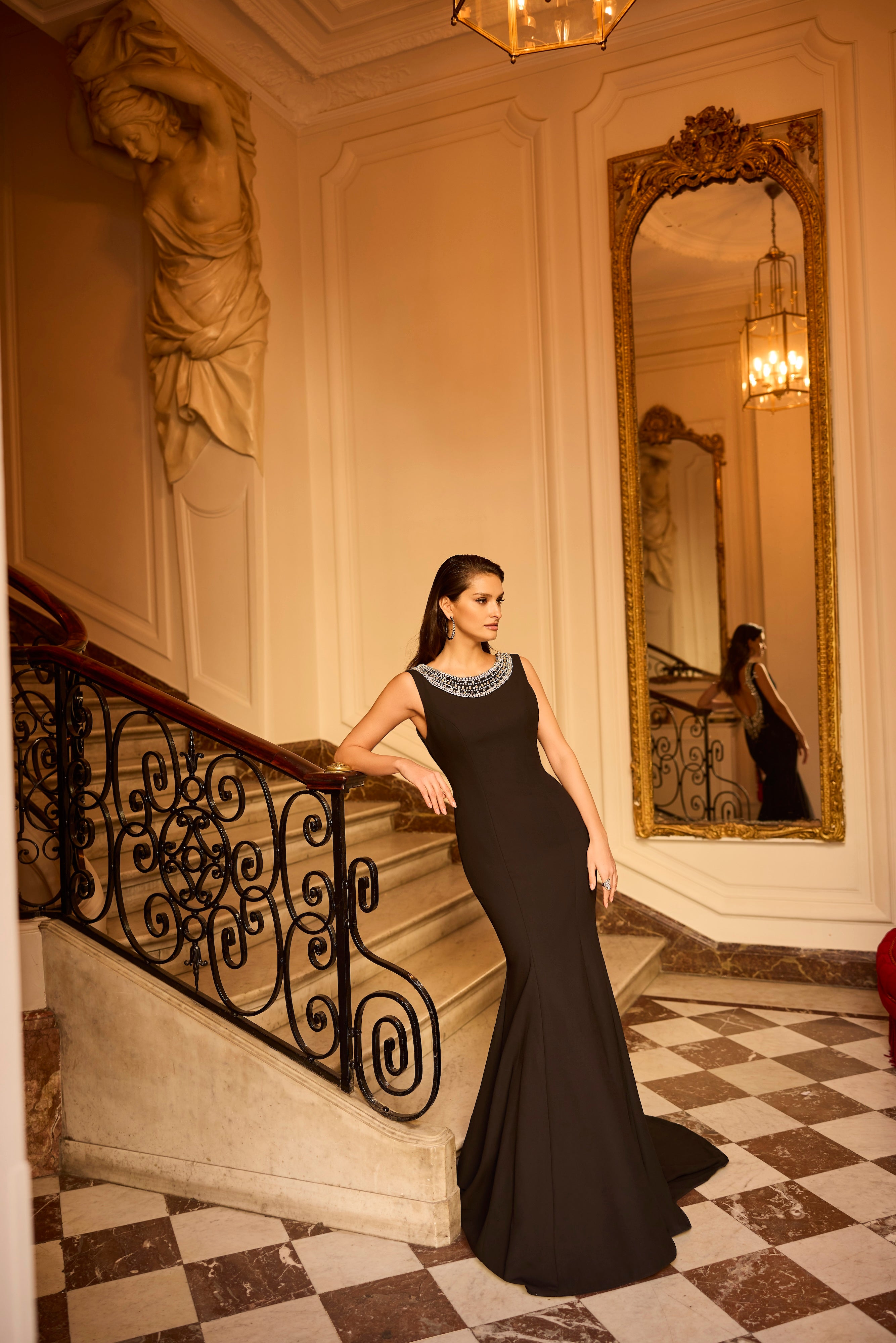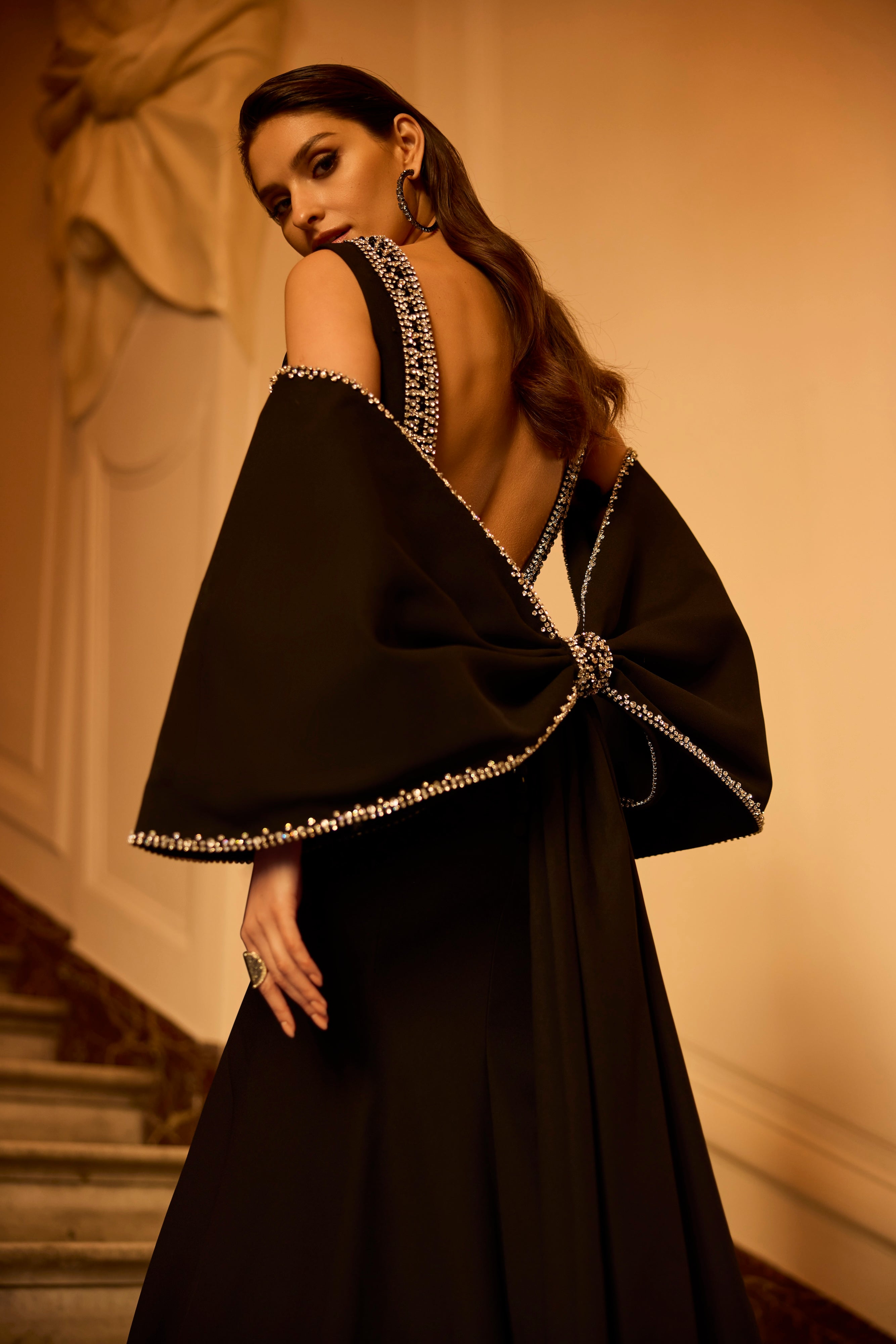 This striking black tie dress from Veni Infantino combines timeless elegance with contemporary detail. The full-length silhouette provides sophisticated coverage, whilst the intricately beaded neckline and back create a focal point of refined glamour. The oversized bow shawl adds a dramatic flourish, offering both style and practical layering for evening occasions. Perfect for formal events, galas, and black-tie affairs, this piece showcases expert craftsmanship and attention to detail that elevates any special occasion wardrobe.