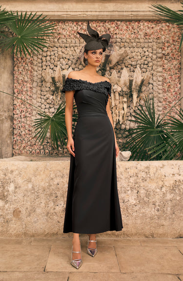 The Veni Infantino 992791 Black dress combines elegance with sophisticated design, featuring a fitted straight crepe skirt in a striking midi to maxi length. Its off-shoulder neckline gracefully highlights the shoulders, complemented by a delicate cape skirt and intricate flower appliqué details. An ideal choice for the mother of the bride or groom, this refined gown suits black-tie events or weddings with its timeless style and flattering silhouette.