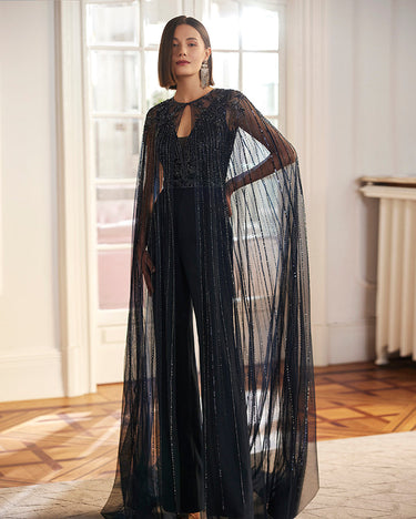 Experience elegance and sophistication with the Marfil 9J89 Navy fitted jumpsuit. The sheer beaded cape adds a touch of glamour to this sleek and stylish piece. Perfect for any special occasion, stand out with this stunning jumpsuit.