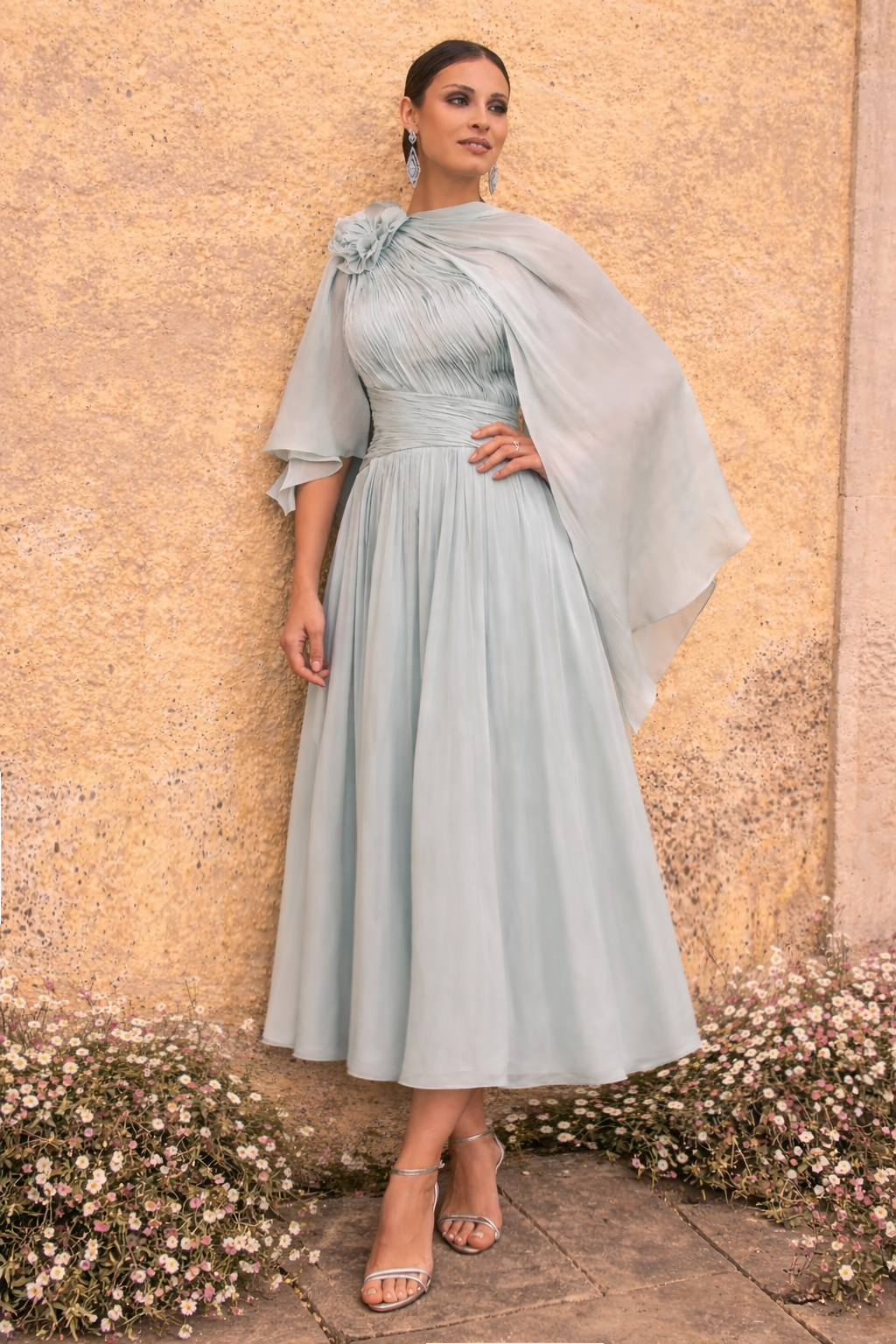 Elevate your black-tie presence with this exquisite Veni Infantino gown, crafted for the discerning mother of the bride or groom. Intricate pleating sculpts the waist and bodice, creating a flattering silhouette that transitions seamlessly into a flowing midi skirt. A luxurious sheer chiffon cape cascades gracefully from the shoulders, crowned with an ornate floral applique that adds sophisticated romantic flair. The grey mint tone offers timeless elegance and versatility, ensuring you'll command attention whilst maintaining understated refinement at any formal occasion.