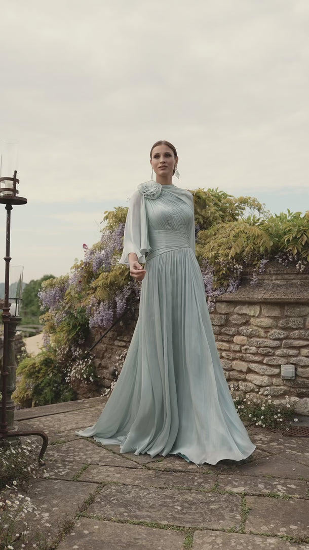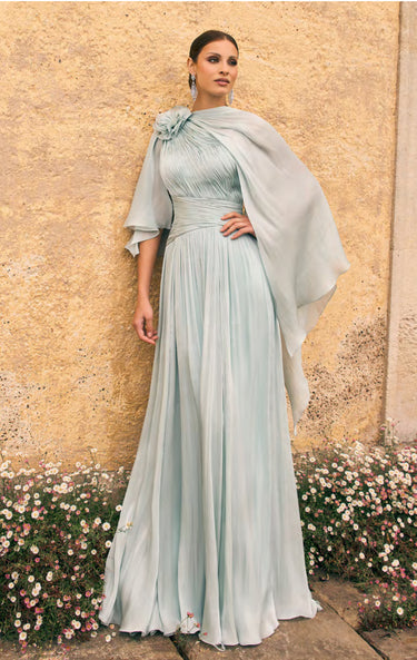Elevate your special occasion ensemble with the Veni Infantino 992667 full-length gown in sophisticated grey and mint liquid chiffon. This gracefully flowing dress offers an elegant silhouette, perfect for mothers of the bride or groom seeking refined style. Its soft fabric and delicate colour palette also make it an excellent choice for black-tie events, blending timeless charm with modern elegance.