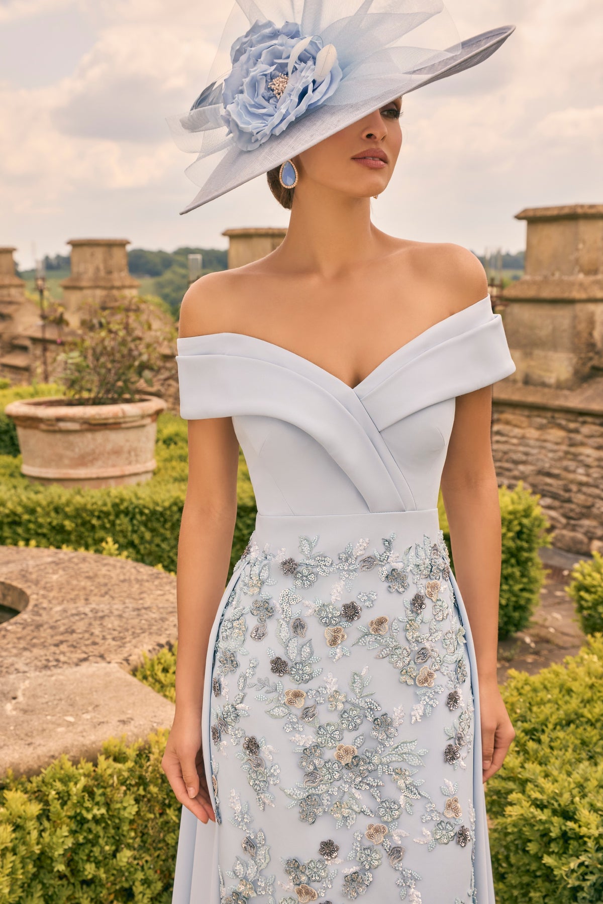 The Veni Infantino 992787A Pale Blue is an elegant crepe dress featuring flower lace applique and a straight caped skirt with exquisite beaded lace detailing. Its off-shoulder design and plain bodice create a refined silhouette, making it an ideal choice for a mother of the bride or groom, or for black-tie events. The blend of sophisticated fabrics ensures both comfort and timeless style at your special occasion.