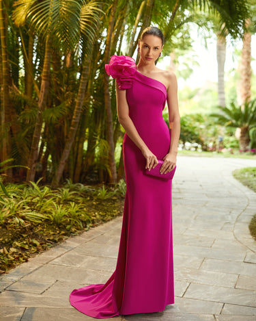 Make a striking impression at your next formal occasion in this exquisite AIRE BARCELONA 1UA2 gown. Crafted from luxurious crepe, this fuchsia masterpiece features dramatic ruffled detailing and voluminous layers that create movement and elegance. The asymmetric neckline adds contemporary sophistication, whilst the refined silhouette suits black-tie events perfectly. An ideal choice for mothers of the bride or groom seeking a show-stopping ensemble that balances glamour with timeless style.