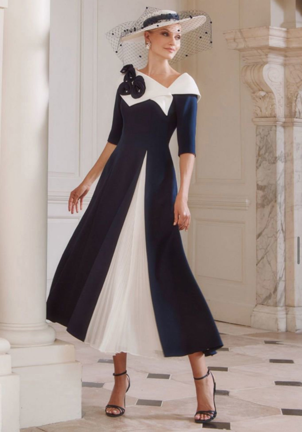 This John Charles 29321SV midi dress features a sophisticated navy and ivory crepe fabric with elegant cutwork detailing. Designed with 3/4 sleeves, it offers a refined silhouette perfect for mother of the bride or groom at formal events. The combination of classic colors and intricate craftsmanship ensures a timeless and polished look for special occasions.