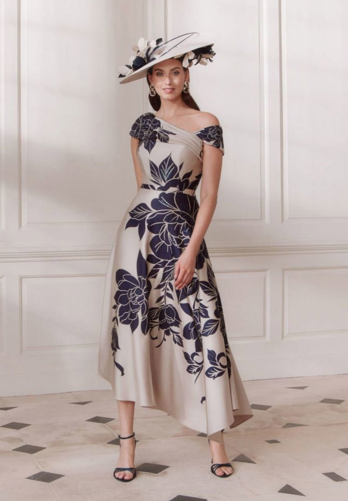 This John Charles 66770 dress features a sophisticated navy and oyster printed crepe fabric, tailored into an elegant A-line midi silhouette. Designed with the mother of the bride or groom in mind, it offers a refined and flattering fit that combines comfort with timeless style, perfect for formal occasions.