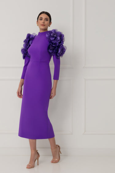 The Matilde Cano 2808 Violet midi dress stands out with its distinctive shoulder details, creating a sophisticated and elegant silhouette perfect for mothers of the bride or groom. Its tailored fit and refined design make it a statement piece for formal events, ensuring a graceful and polished presence that commands attention on any special occasion.