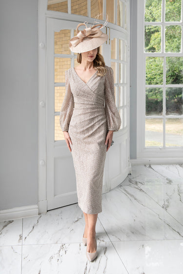 The Irresistible IR8803K in lustrous gold delivers timeless elegance for mothers of the bride or groom. This midi fitted dress features delicate lace detailing and a sophisticated faux wrap design that flatters the silhouette whilst offering refined movement. The long sleeves provide understated grace, making it an ideal choice for formal occasions where you want to look polished and poised. Crafted with attention to detail, this piece combines classic styling with contemporary sophistication—a wardrobe essential for those seeking to make a memorable impression at life's most important celebrations.