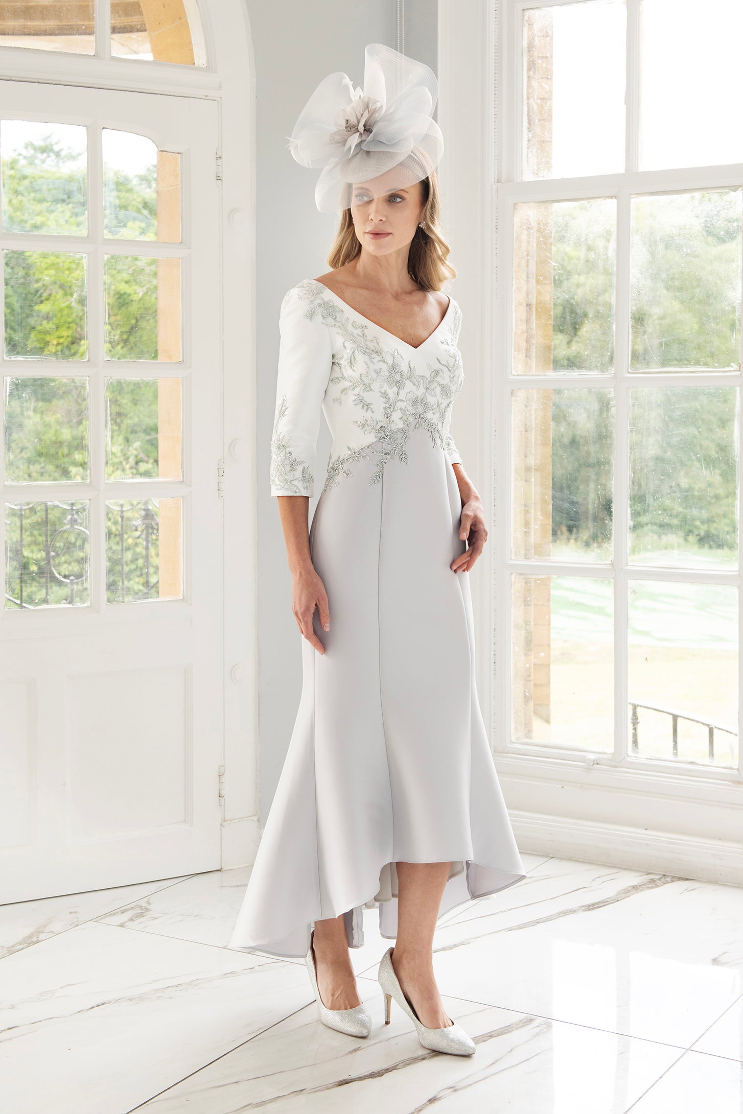 Elevate your role in the celebration with this sophisticated Irresistible IR8812TJ mother of the bride or groom dress. Crafted in elegant ivory and silver tones, this fit and flare silhouette flatters the figure whilst the dipped hemline adds contemporary flair. The embroidered bodice showcases intricate detailing, whilst the V-neckline and three-quarter sleeves provide refined coverage and timeless appeal. Perfect for creating a polished, memorable look at your special day.