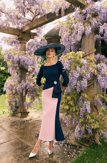 This Veni Infantino 992706 dress in navy and blush features a midi length and fitted silhouette that flatters the figure. Crafted from elegant crepe fabric, it offers a refined texture and subtle flare at the skirt for graceful movement. The three-quarter sleeves enhance its sophisticated appeal, making it an ideal choice for mothers of the bride or groom, or for attending formal events. This dress blends classic design with modern tailoring to ensure a polished, confident look on any special occasion.