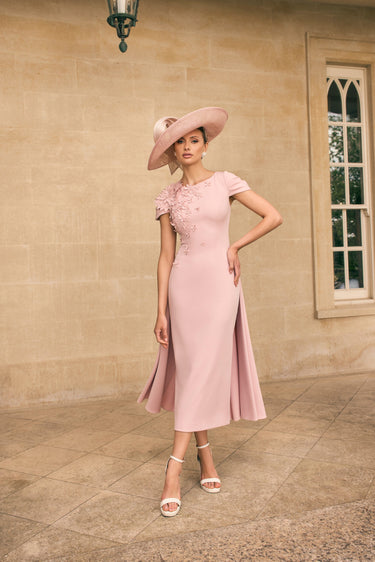 This Veni Infantino 992719B dress in blush features elegant cap sleeves and a distinctive caped skirt, enhanced by delicate applique detailing. Its midi length and fitted silhouette make it an ideal choice for mothers of the bride or groom seeking a refined and sophisticated look for special occasions.