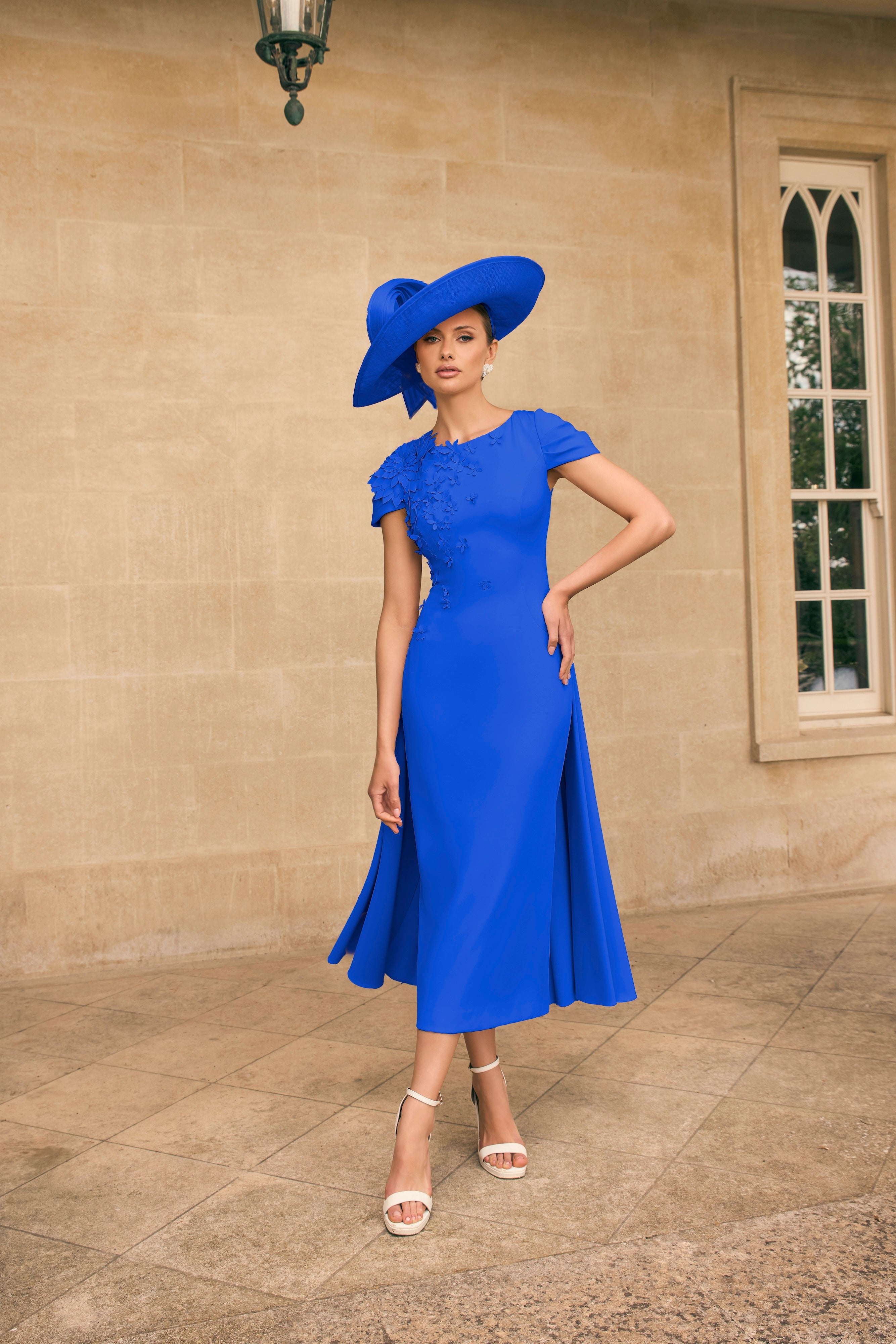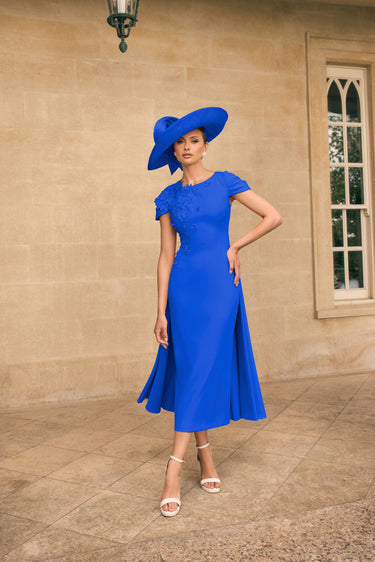 This Veni Infantino 992719B dress in magenta features elegant cap sleeves and a distinctive caped skirt, enhanced by delicate applique detailing. Its midi length and fitted silhouette make it an ideal choice for mothers of the bride or groom seeking a refined and sophisticated look for special occasions.