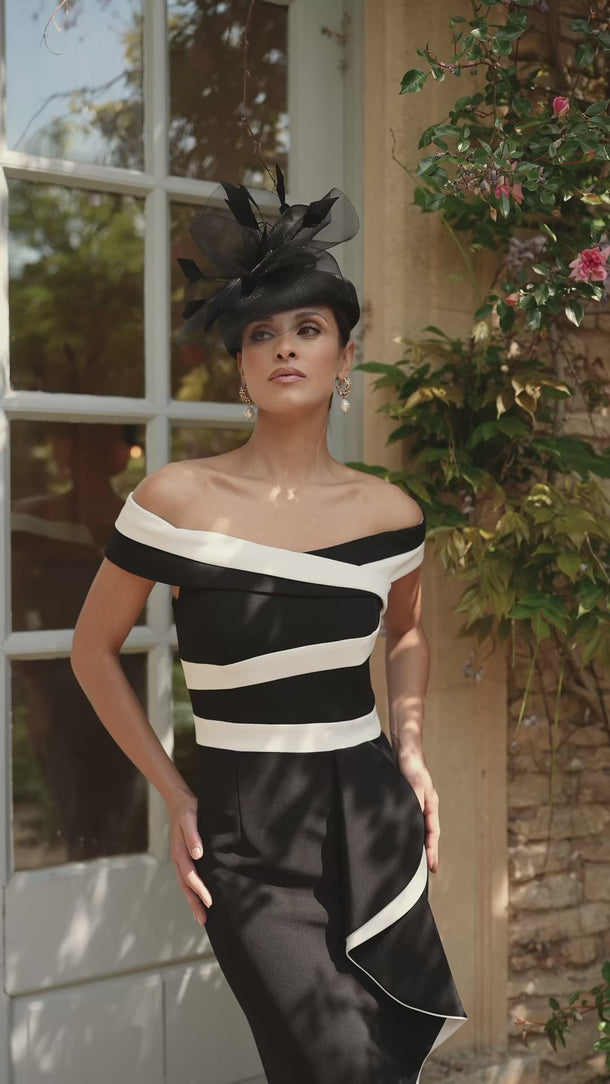 This Veni Infantino 992735L dress in black and ivory combines elegant crepe fabric with a sophisticated full-length silhouette. Designed with a fitted shape and a front knee-high split, it offers refined movement and grace. The off-shoulder style enhances its formal appeal, making it an excellent choice for a mother of the bride or groom or attending a black-tie event.