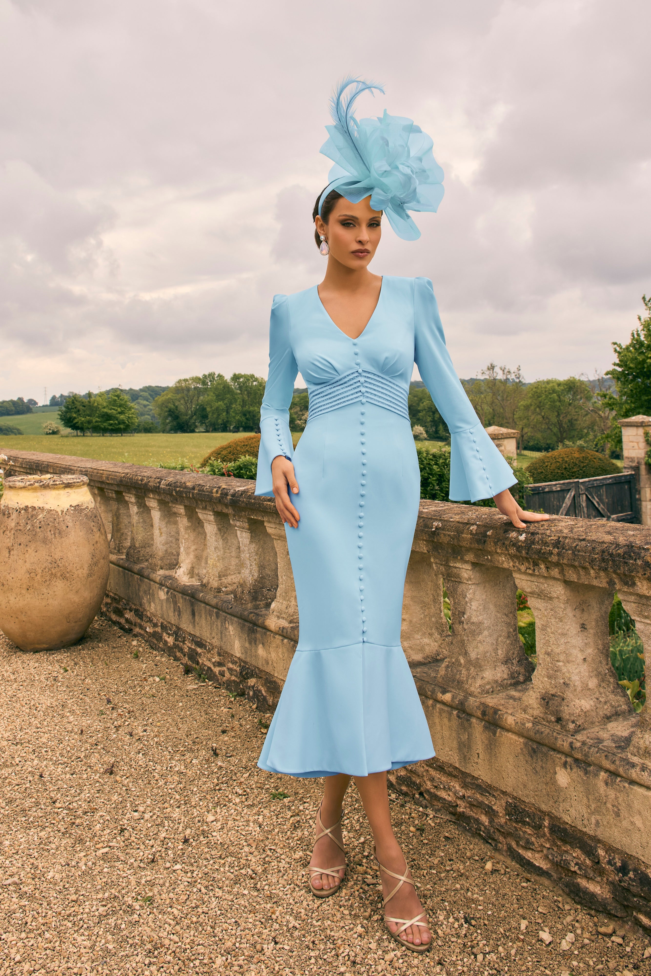 This Veni Infantino 992752 dress in pale blue offers a sophisticated midi length with a fitted silhouette that accentuates your figure. Featuring a graceful fishtail hem, long sleeves, and a flattering V-neckline with button detailing at the front, it combines elegance with subtle unique touches. Ideal for mother of the bride or groom occasions and race day events, this dress provides a refined, polished look suitable for formal daytime gatherings.