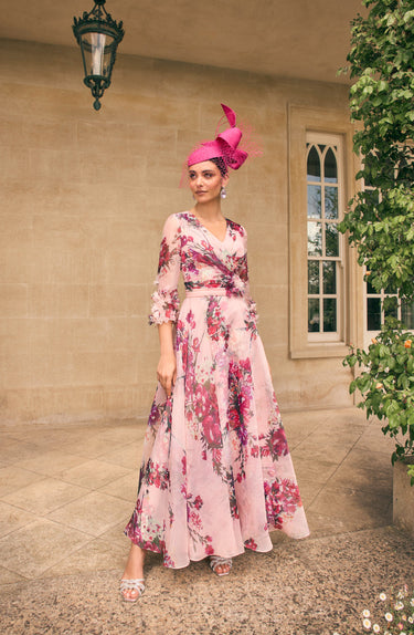 The Veni Infantino 992774 Summer Berry maxi dress showcases an elegant A-line silhouette with 3/4 length sleeves, crafted from organza featuring a subtle print and matching print lining. Delicate applique flowers enhance the sophisticated design, making it an ideal choice for mothers of the bride or groom. This dress combines graceful style with lightweight comfort, perfect for formal occasions and memorable events.