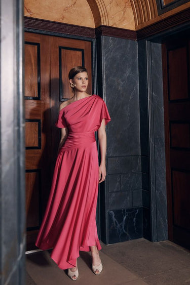 Maisonel ME3138 in Cherry Pink. Elevate your role as mother of the bride or groom in this sophisticated Maisonel design. The striking cherry pink hue commands attention whilst the asymmetric silhouette delivers contemporary elegance. An accentuated waist creates a refined, flattering line that defines your figure with understated luxury. This modern gown balances bold design with timeless grace, ensuring you look polished and poised throughout the celebration. Perfect for those seeking a statement piece that transcends traditional occasion wear.