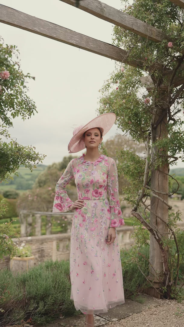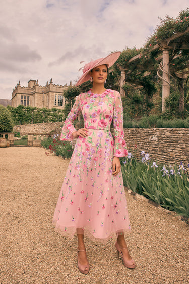 This Veni Infantino 992721 midi dress in blush and multi tones features an elegant A-line silhouette crafted from embroidered tulle and organza. Designed with long sleeves, it offers a refined and graceful look perfect for summer events. Ideal for mothers of the bride or groom, this dress combines delicate detailing with comfortable wearability, ensuring you look sophisticated and feel confident throughout the occasion.