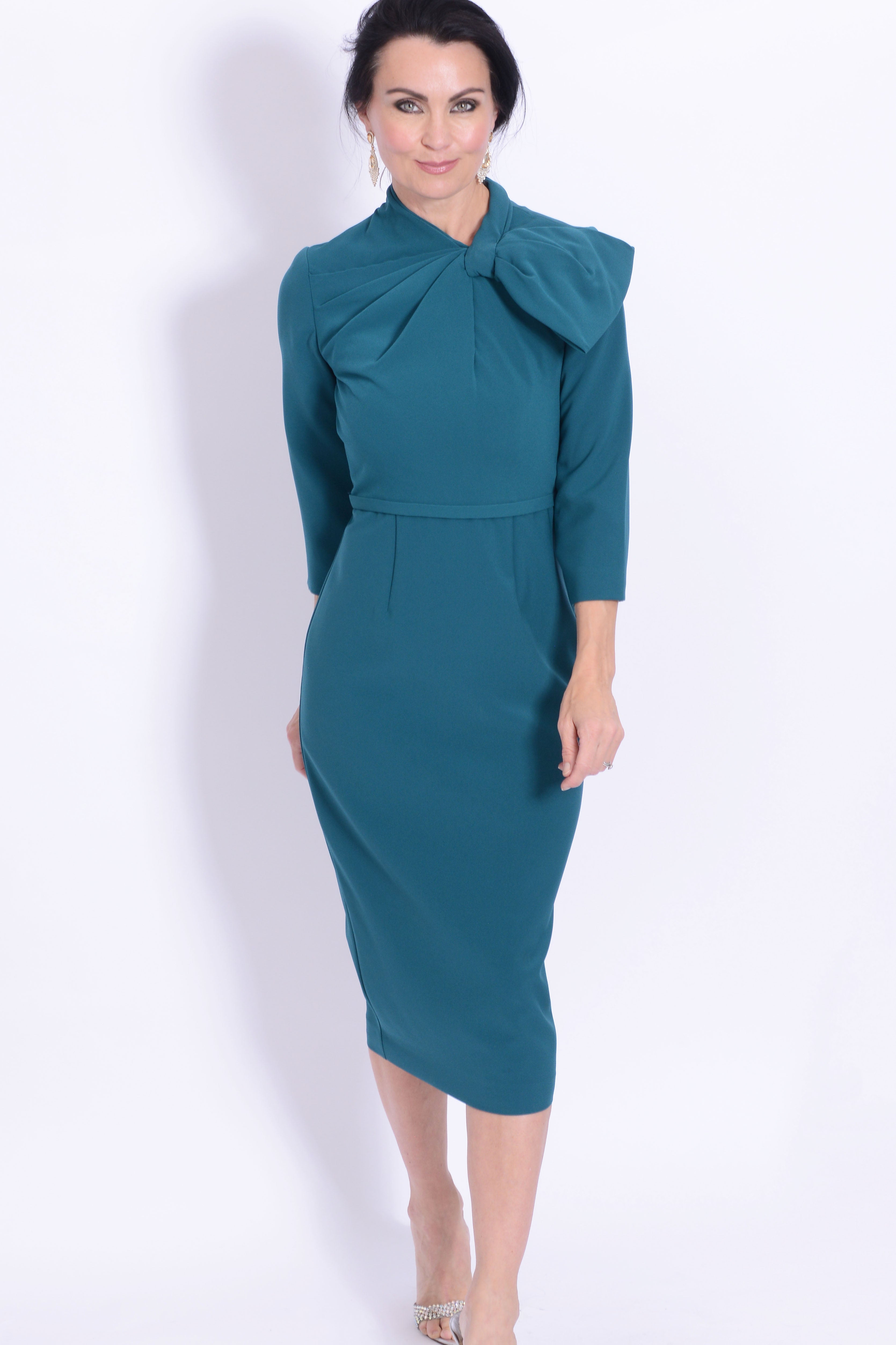 A simple yet effective Mother of the Bride and Groom outfit. The dress has a plain skirt with faux tie bow neckline. Also available in Silver and baby blue.
