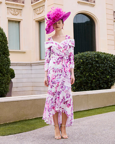 This Couture Club 1GB5 dress in purple and ivory features a sophisticated floral print and a stylish midi dipped hem, perfect for a mother of the bride or groom. The elegant 3/4 sleeves provide balanced coverage while maintaining a refined silhouette, making it an ideal choice for formal occasions. Crafted to combine comfort and grace, this dress enhances your presence with its flattering cut and timeless colour palette.