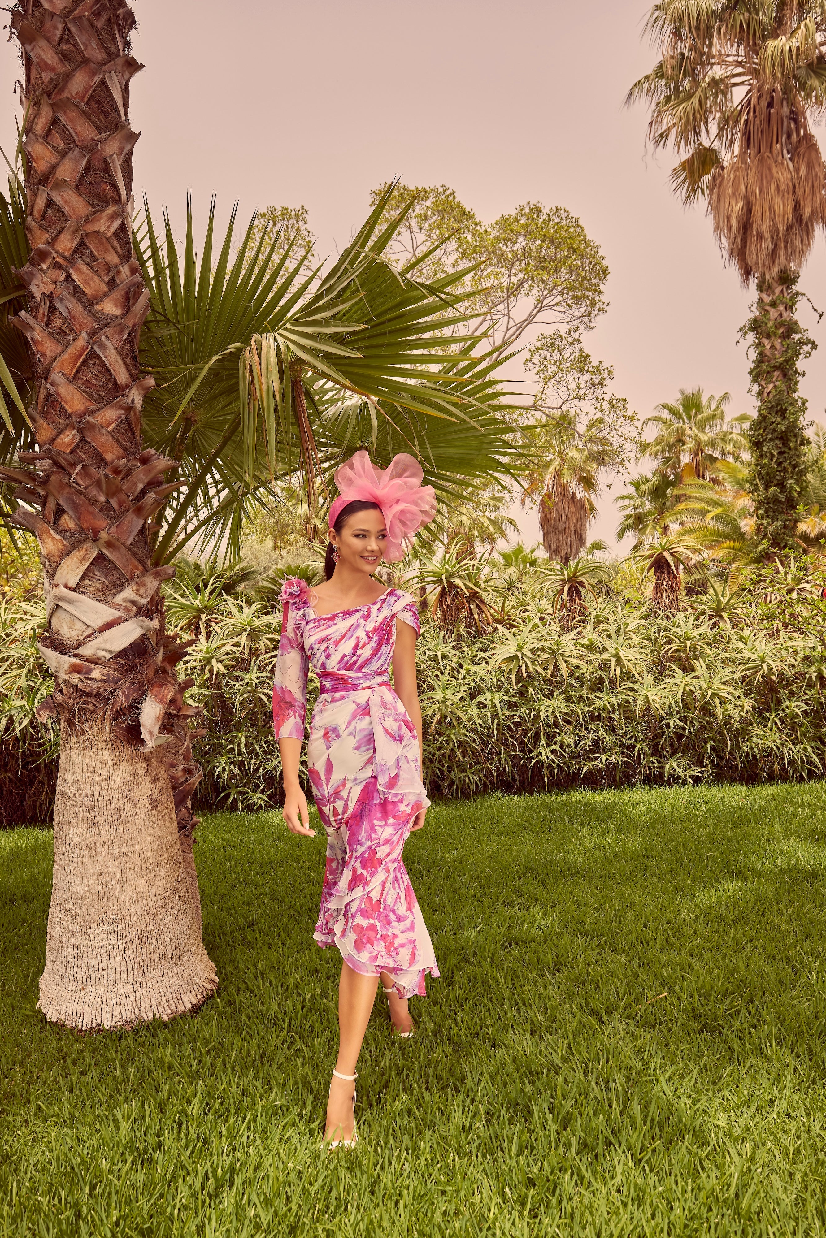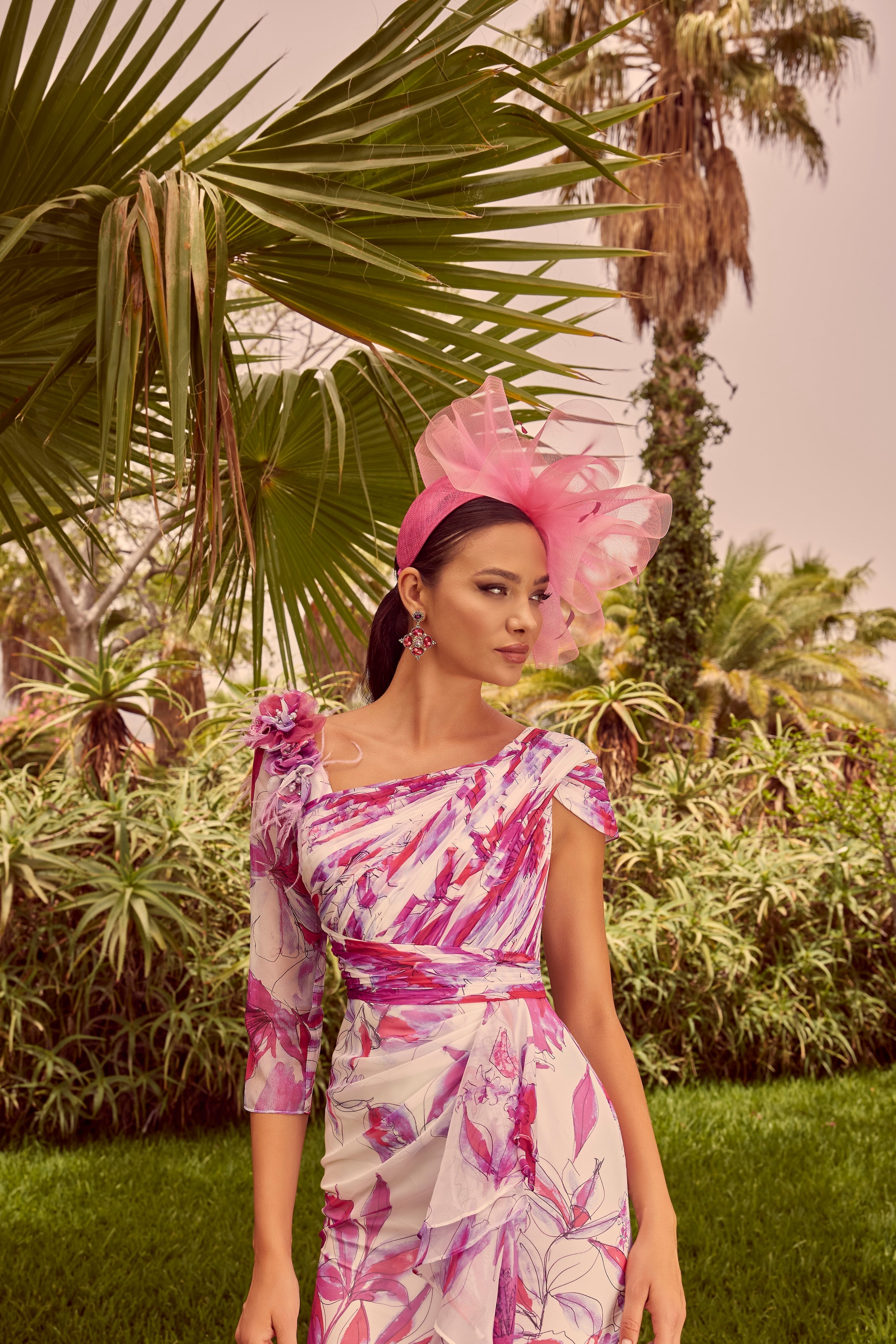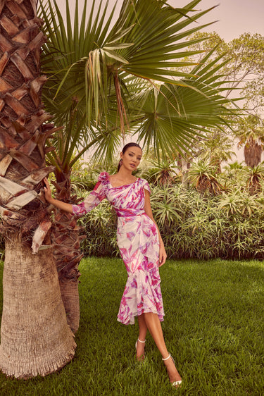 Elevate your event with Invitations by Veni 36123 Fuchsia / ivory print dress. The chiffon print, asymmetrical design, and one sleeved detail add a touch of elegance to any occasion. With a fitted, knee length silhouette, this dress is perfect for making a sophisticated statement.