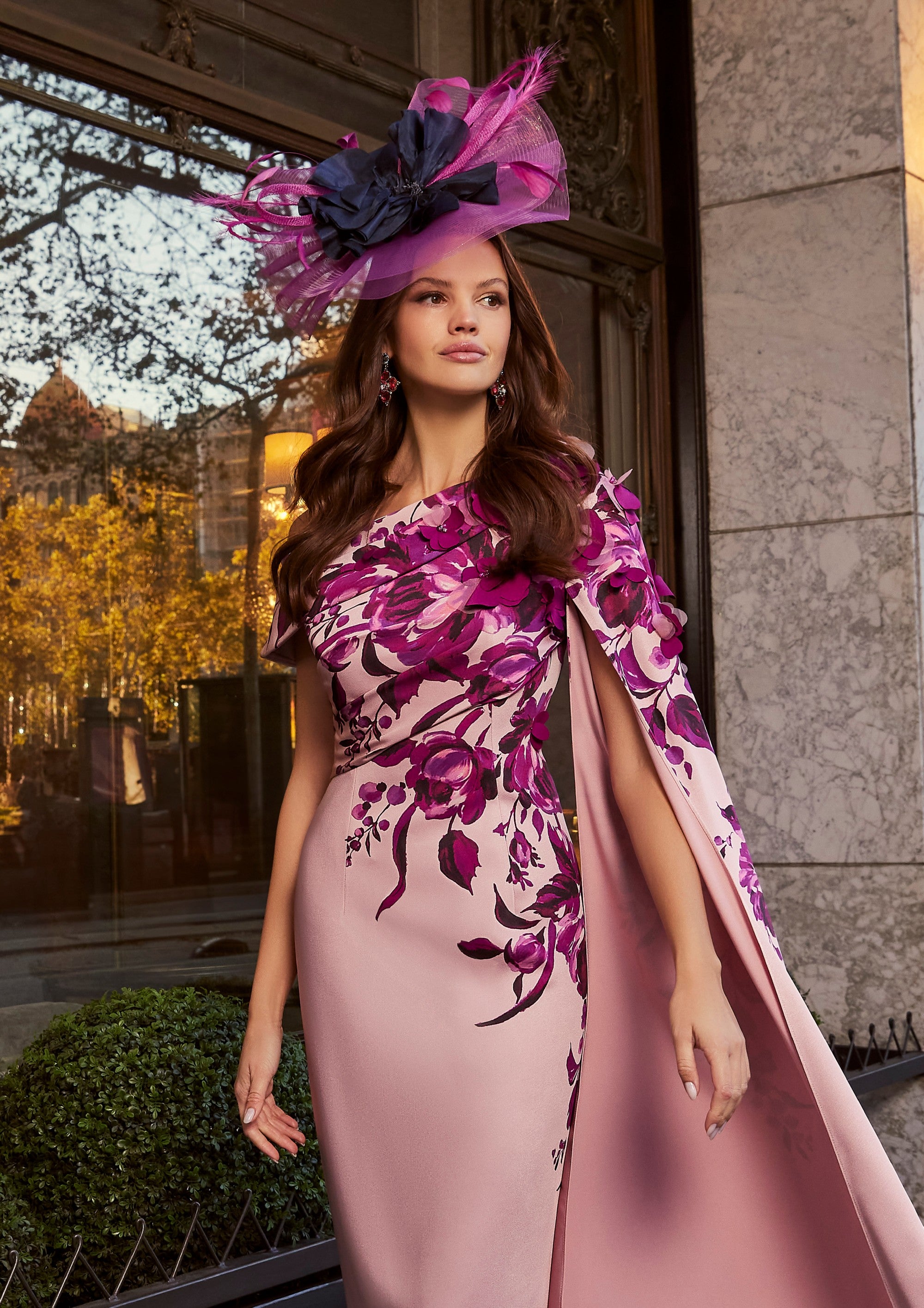This Veni Infantino 992527 dress in rose and wine tones features a modern asymmetrical design with a striking one-shoulder cape sleeve. Its mid-length cut is elegantly enhanced by delicate 3D floral petals, making it an ideal choice for the mother of the bride or groom seeking a sophisticated and distinctive look.