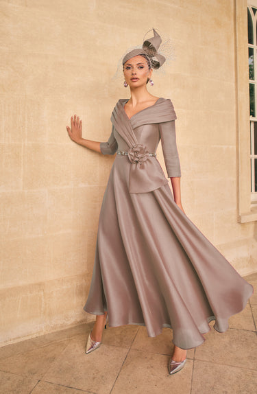 The Veni Infantino 992720A in taupe is an elegant aline midi to maxi dress, expertly crafted in luxurious mikado organza. It features a delicate pleated collar and refined 3/4 sleeves, accented with intricate beaded trim for a sophisticated finish. Ideal for the mother of the bride or groom, this dress balances classic style with modern details, ensuring a graceful and memorable look for any formal occasion.