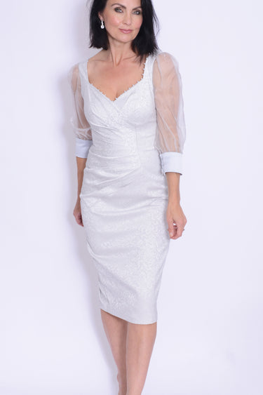A blush jacquard fabric make the centre piece of the dress which is complimented by the organza puff sleeves and unique neckline.