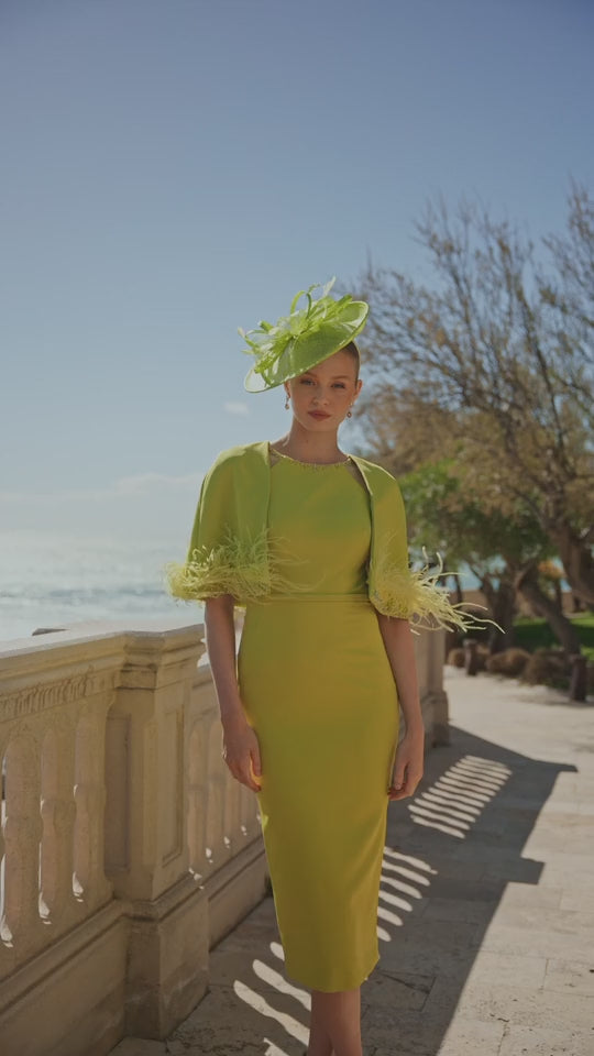 The Couture Club 9G62 Pistachio is a stunning fitted midi dress that exudes elegance and sophistication. With its attached cape featuring intricate feather detailing, this dress is sure to make a statement at any event. The perfect choice for those looking for a touch of couture fashion.