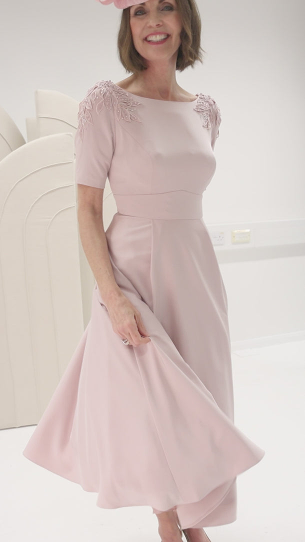 A modern a-line dress with sophisticated shoulder detailing and a cowl back. The dress has a eye catching back cowl.