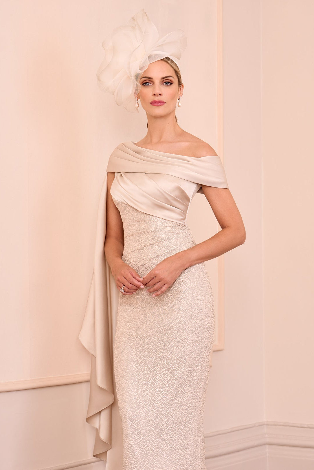 The John Charles 29244 in oyster is an elegant fitted midi dress designed for mothers of the bride or groom or those attending black-tie occasions. Its sophisticated off-shoulder neckline and asymmetric drape create a refined silhouette that flatters whilst maintaining understated glamour. The midi length offers timeless appeal, whilst the structured fit ensures a polished appearance throughout the evening. Perfect for formal celebrations where refined elegance is paramount.