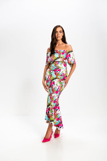 The Kevan Jon Arabella Flare Multi print dress offers a sophisticated off-shoulder silhouette, perfectly tailored for mother of the bride or groom occasions. Its fitted design enhances the figure while the vibrant multi print adds a contemporary edge, making it an ideal choice for summer events. Crafted to combine elegance with comfort, this dress ensures you look polished and feel confident throughout your special day.