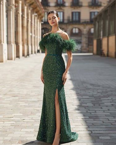 Expertly crafted, the Martha Blanc 9V09 Juniper Green gown exudes elegance and sophistication. With a full length design, stunning beadwork, feathered edging, and a front split, this gown is perfect for a special occasion. Stand out in style and turn heads wherever you go with this spectacular gown.