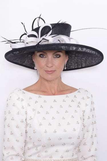 This beautifully designed large brimmed Mother of the Bride or Groom sinamay hat is a best selling classic piece. The large yet delicately detailed trim has movement and balance, creating volume without looking heavy. The elegant size and shape make it so versatile, suiting all ages, face shapes and occasions.