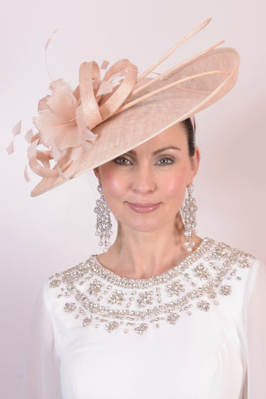 Nigel Rayment's Hatinator in Style 39 showcases a timeless design with a striking trim. The elegant brim features a feather flower and quill embellishment. Dimensions include 42cm side to side and 36cm front to back measurements.