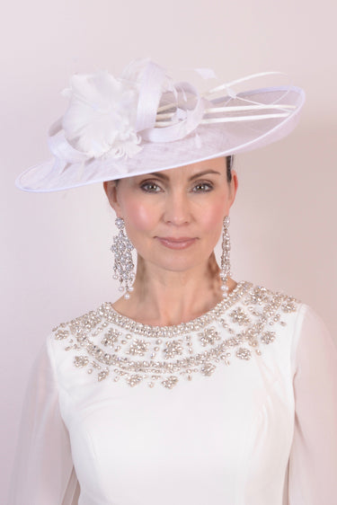 Nigel Rayment's Hatinator in Style 39 showcases a timeless design with a striking trim. The elegant brim features a feather flower and quill embellishment. Dimensions include 42cm side to side and 36cm front to back measurements.