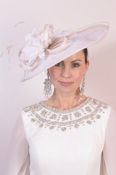 Nigel Rayment's Hatinator in Style 39 showcases a timeless design with a striking trim. The elegant brim features a feather flower and quill embellishment. Dimensions include 42cm side to side and 36cm front to back measurements.