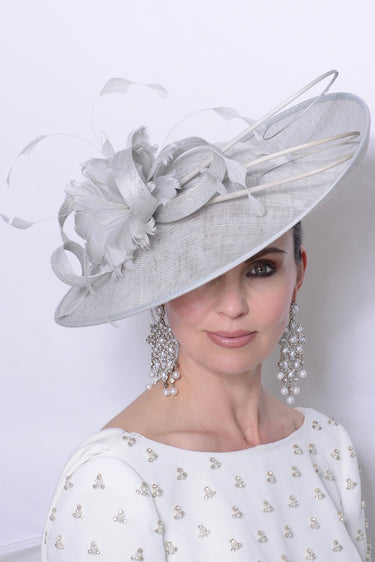Nigel Rayment's Hatinator in Style 39 showcases a timeless design with a striking trim. The elegant brim features a feather flower and quill embellishment. Dimensions include 42cm side to side and 36cm front to back measurements.
