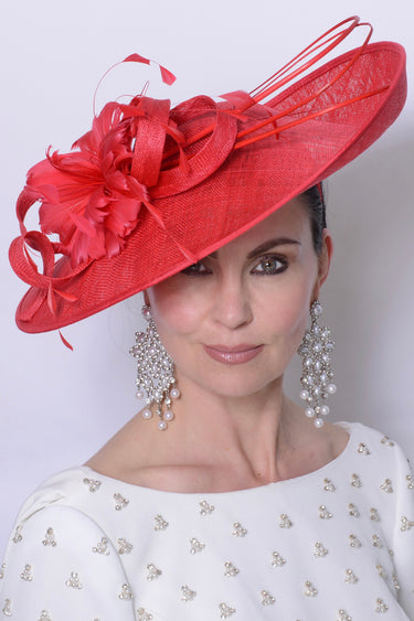Nigel Rayment's Hatinator in Style 39 showcases a timeless design with a striking trim. The elegant brim features a feather flower and quill embellishment. Dimensions include 42cm side to side and 36cm front to back measurements.