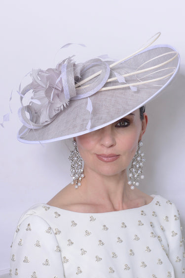 Nigel Rayment's Hatinator in Style 39 showcases a timeless design with a striking trim. The elegant brim features a feather flower and quill embellishment. Dimensions include 42cm side to side and 36cm front to back measurements.